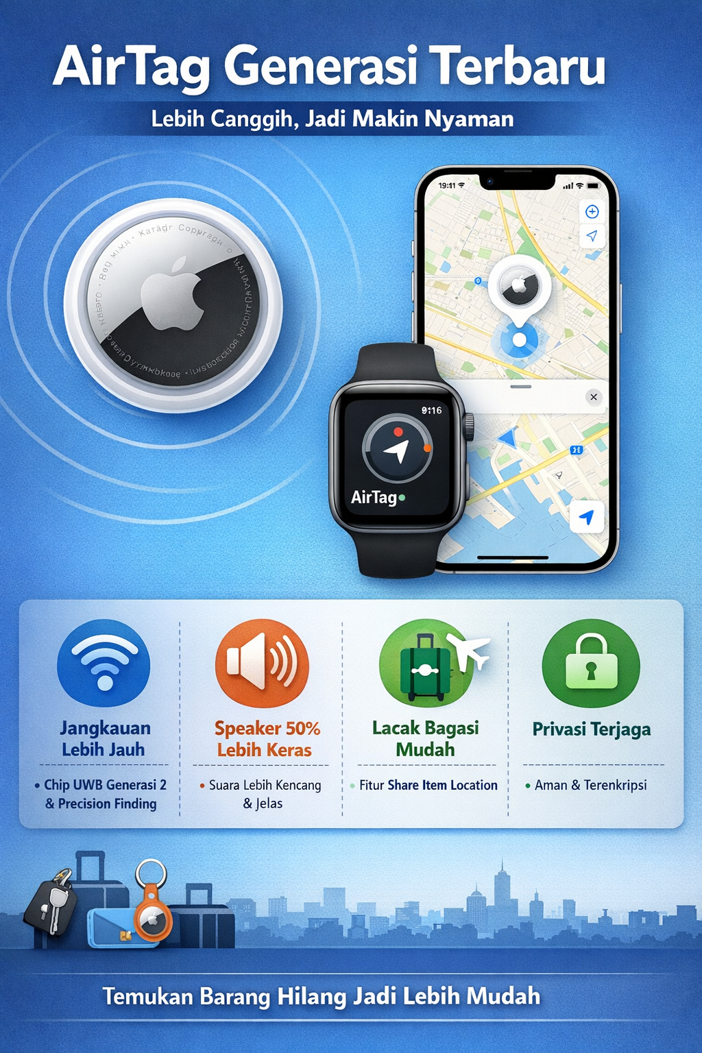 Medan – Apple resmi meluncurkan AirTag generasi terbaru dengan sejumlah peningkatan penting, mulai dari jangkauan pencarian yang lebih luas, akurasi pelacakan yang lebih baik, hingga suara notifikasi yang lebih keras. Aksesori pelacak ini ditujukan untuk membantu pengguna menemukan berbagai barang pribadi, seperti kunci, dompet, tas, dan koper perjalanan, melalui aplikasi Find My.